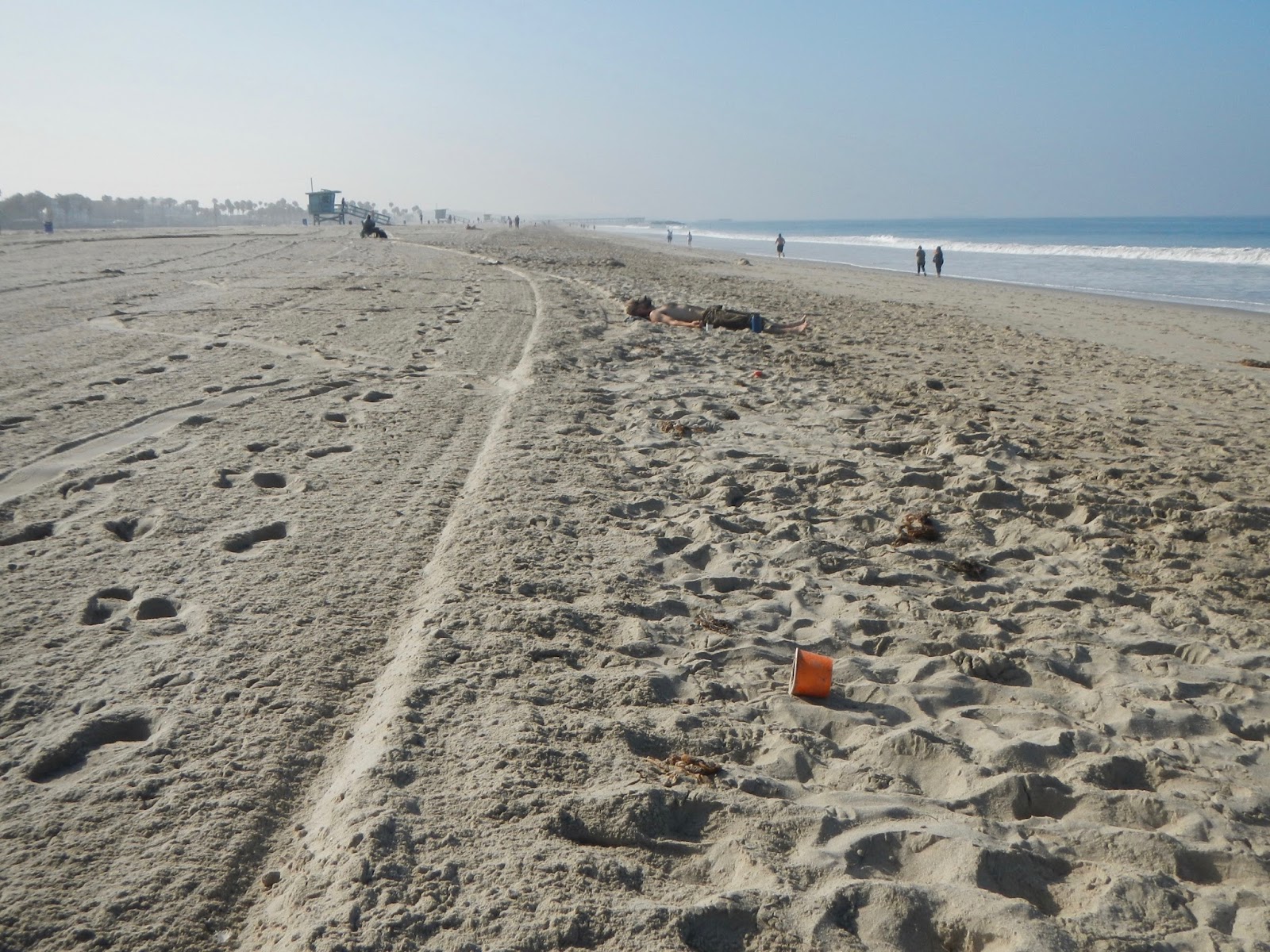 Dateline: Saturday morning, July 29, 2017 along Venice Beach from Navy St. to the Venice Pier, I walked near the water's edge and took numerous photos of uncollected #beachtrash which the L.A. County Dept. of Beaches & Harbors (aka, LACDBH) continues to avoid cleaning up by hand in order to dispose of it. It was obvious today that LACDBH will go to extraordinary lengths to avoid assigning its staff to walk along the shoreline and to hand pick up and dispose of #beachtrash. This was proven by the tractor marks in the sand below the high tide line and below the "Wrack" line, e.g., the area along the high tide line where seaweed and kelp collects. It is this area that LACDBH is not supposed to use its tractors and rakes. Today, however, between Ave 23 and the Venice Pier it was quite obvious that LACDBH ran its tractors and rakes way too close to the water's edge and below the "Wrack" line.