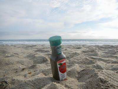 Below, I placed this empty glass bottle up on the sand next to a piece of storm debris in the hopes that LACDBH might see it and pick it up and dispose of it... Of source, if LACDBH only runs its tractor pulling a rake this bottle will most likely not get disposed of.